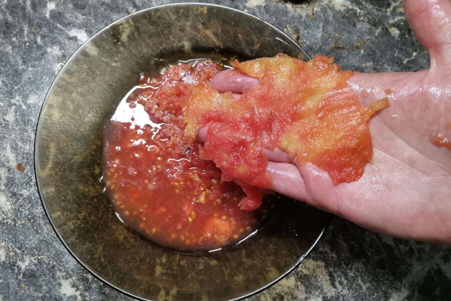 - Свежие помидоры измельчаем на терке или в блендере. Я предпочитаю делать это на крупной терке, оставляя в руках шкурку. Подсаливаем. Если используете томатную пасту – разведите в стакане воды 2 ст. л., размешайте, посолите.