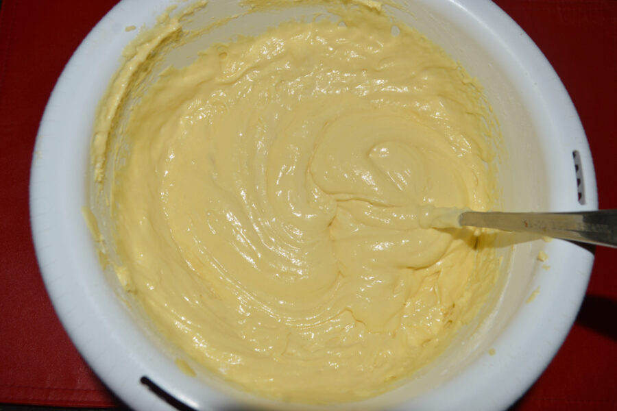 - Добавьте масло к яичным желткам и перемешайте венчиком до однородности.
