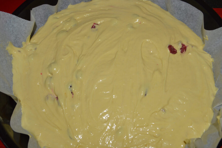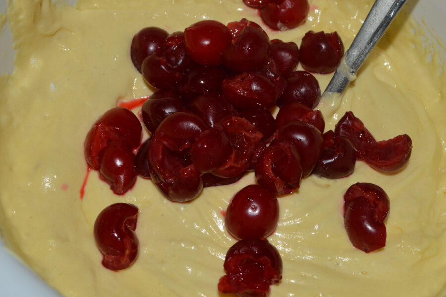 - Добавьте в смесь 1/3 часть вишен и перемешайте.