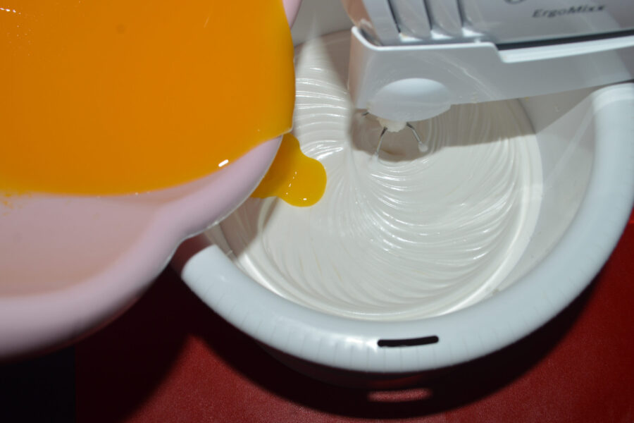 - Влейте желтковую смесь в пену из яичных белков.