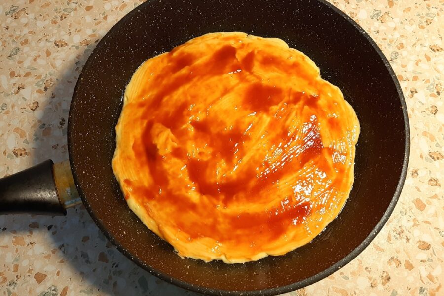 - Смазываем сковороду каплей растительного масла. Много масла не надо, иначе пицца будет жирная. Выкладываем тесто и распределяем его по всей сковороде.