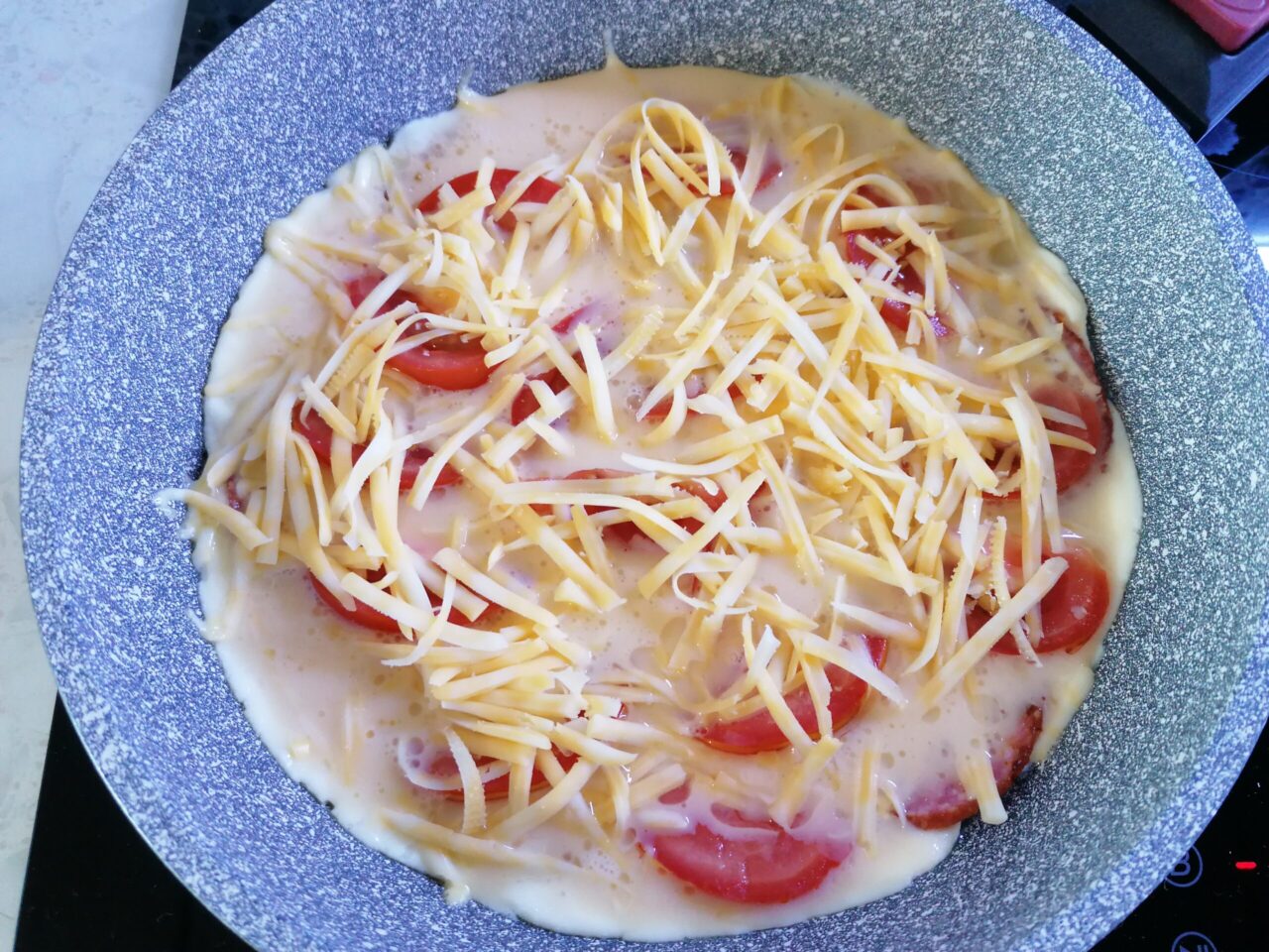- Помидор моем и нарезаем кружочками или полукругом. После того как сервелат немного обжарился, выливаем сверху яйца с молоком. Сверху распределяем помидор.