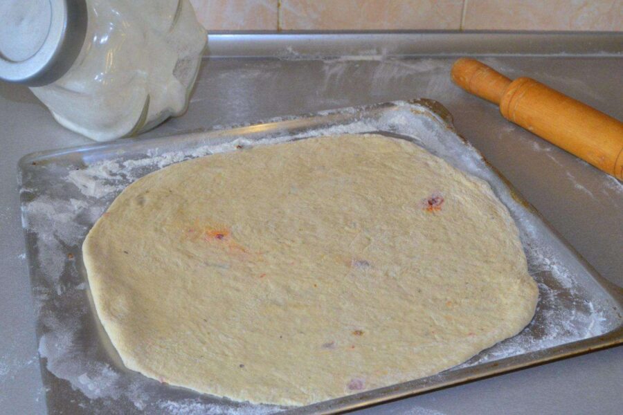 - Можете приготовить дрожжевое тесто сами по проверенному рецепту. Но проще и быстрее купить готовое охлажденное в кулинарии. Останется только тоненько раскатать по размеру вашего противня.