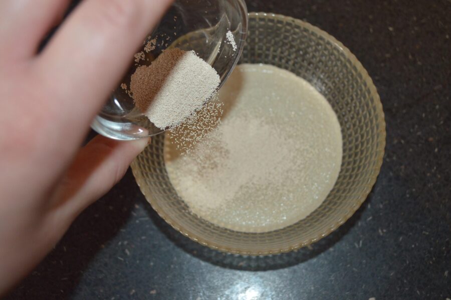 - Поместите сухие дрожжи в слегка подогретую воду комнатной температуры.