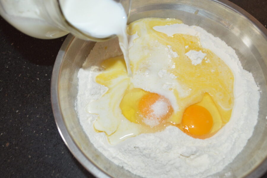 - Добавьте в муку яйца, сахар, соль, растопленное масло, теплое молоко и дрожжи.