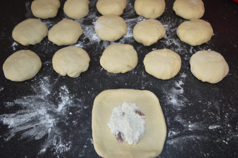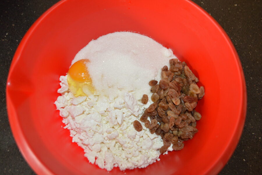 - Приготовьте начинку: добавьте в творог яйцо, сахар и изюм, хорошо перемешайте. (Изюм замочите в кипятке на 15 минут, затем слейте воду).