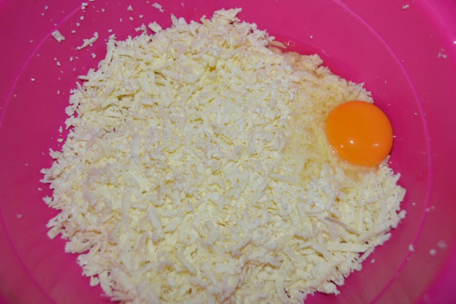 - Приготовьте начинку: натрите на терке соленый творог (брынза) и добавьте яйцо. Перемешайте. Если вы используете обычный творог, то вам нужно будет добавить в него немного соли.