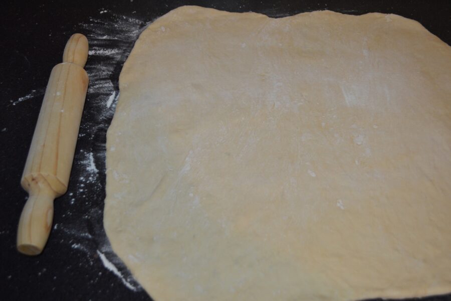 - После того, как тесто увеличилось в объеме, раскатайте его на столе с помощью скалки.