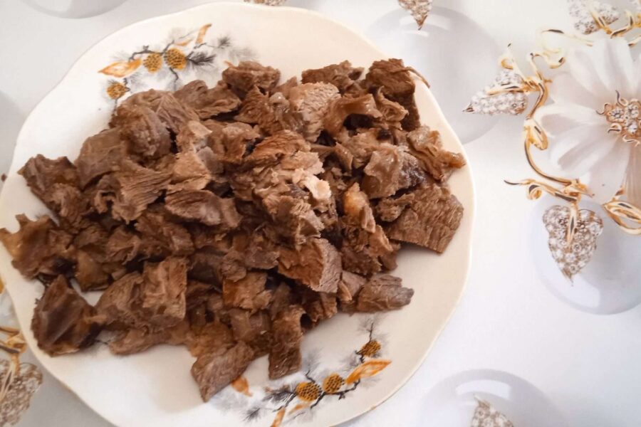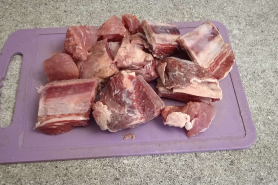 - Пока мы занимались овощами, мясо потушилось. Отделяем мясо от костей и возвращаем в казан.