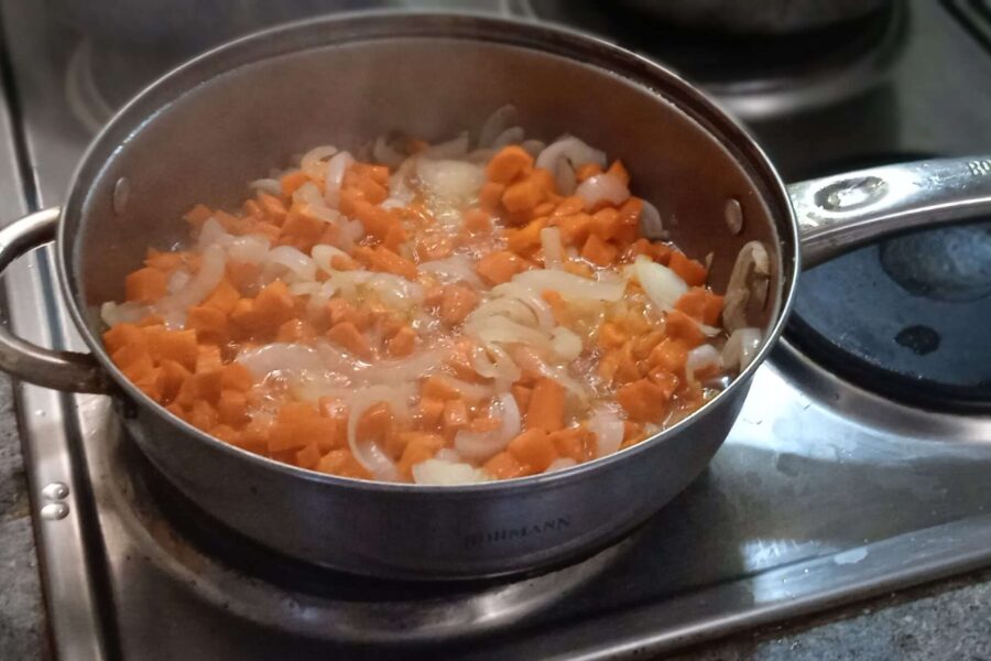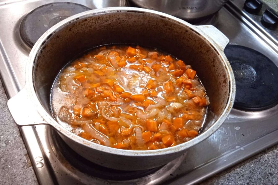 - В сковороду, в масло, где обжаривали ребра, пускаем лук. Обжариваем пока лук не поменяет цвет и станет как волос у блондинки. Добавляем морковку. Обжариваем, помешивая, пока морковь не станет квелой.