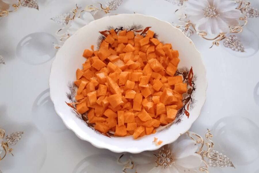 - Морковь крупно. Либо кубиками, либо брусочками. На терке не желательно. Иначе, как говорят узбеки, морковь потеряется.