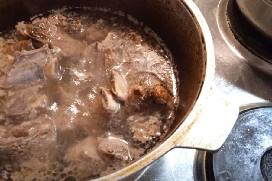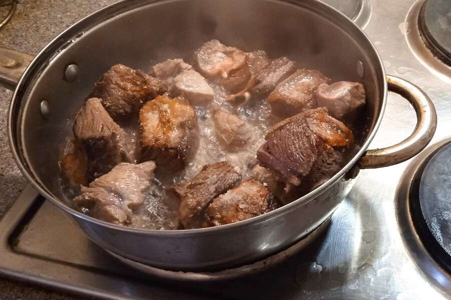 - Перекладываем ребра в казан, заливаем водой, чтоб все покрылось. Доводим до кипения, убавляем огонь и тушим 30 минут под крышкой. Воду необходимо посолить.