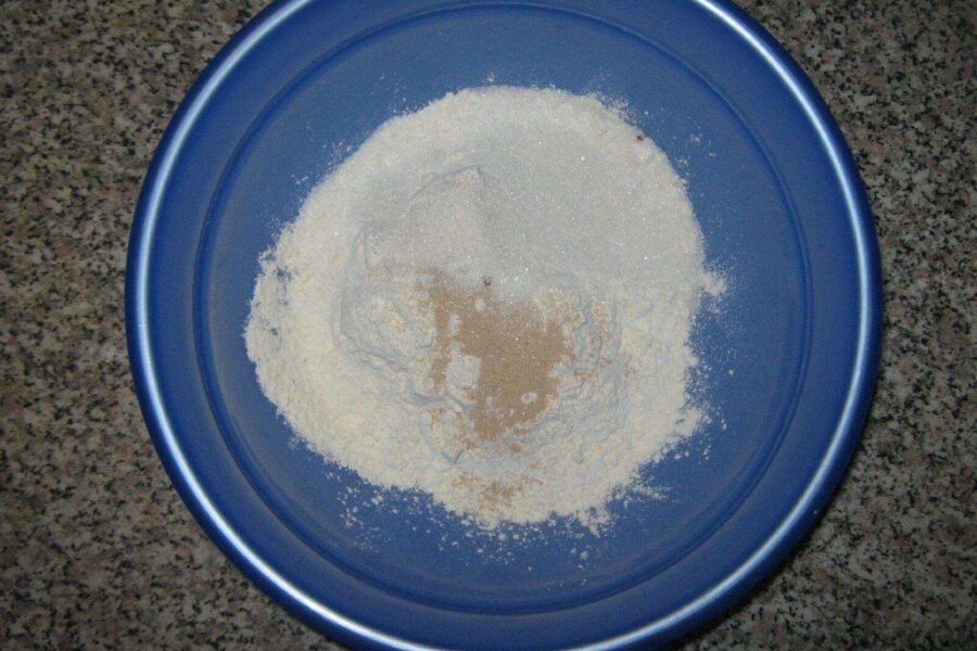 - В глубокой емкости смешиваем муку, сахар, дрожжи.