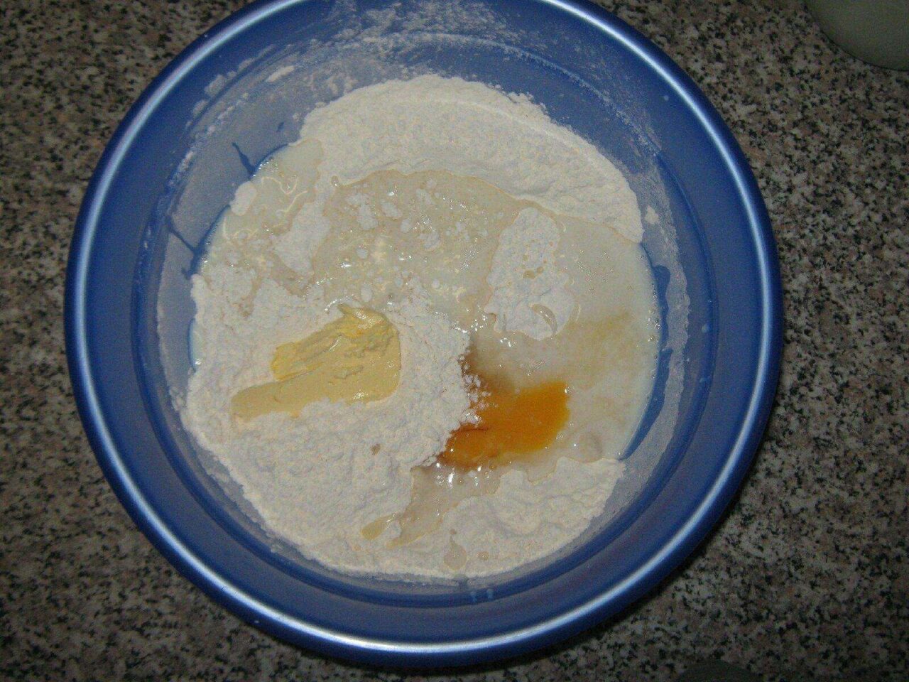 - К полученной смеси добавляем теплую воду и теплое молоко, вбиваем яйцо, солим, добавляем размягченное сливочное масло. Все хорошо перемешиваем, замешивая тесто.