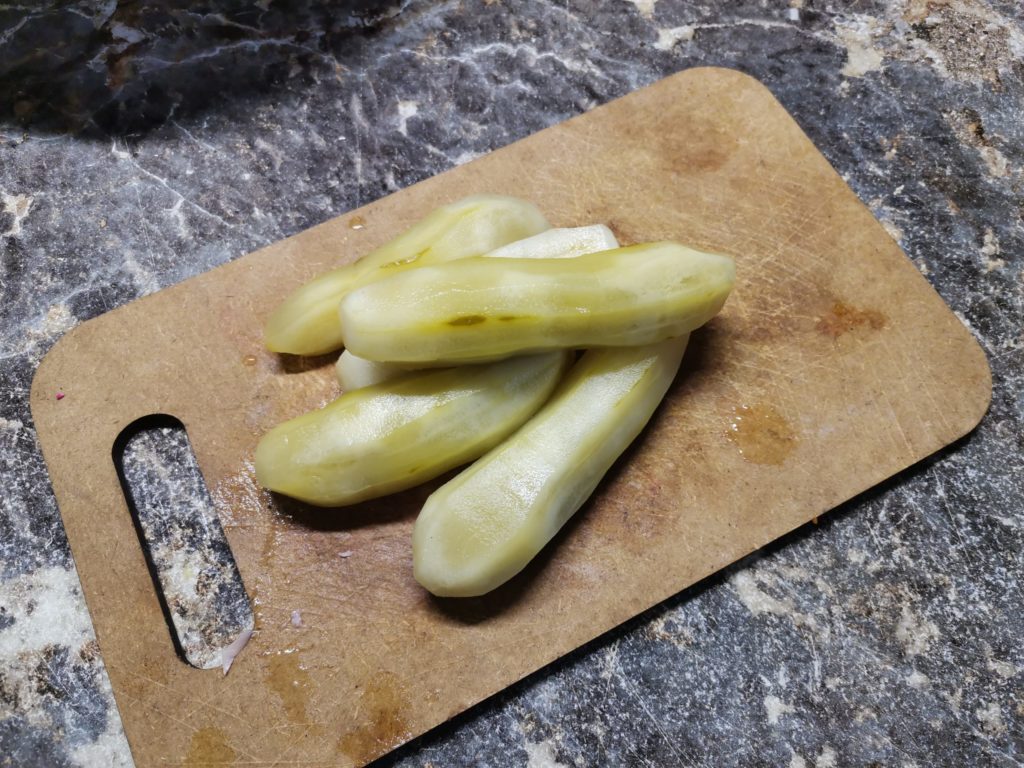 - Маринованные огурцы очищаем от кожицы. Так вкус блюда будет более нежным.