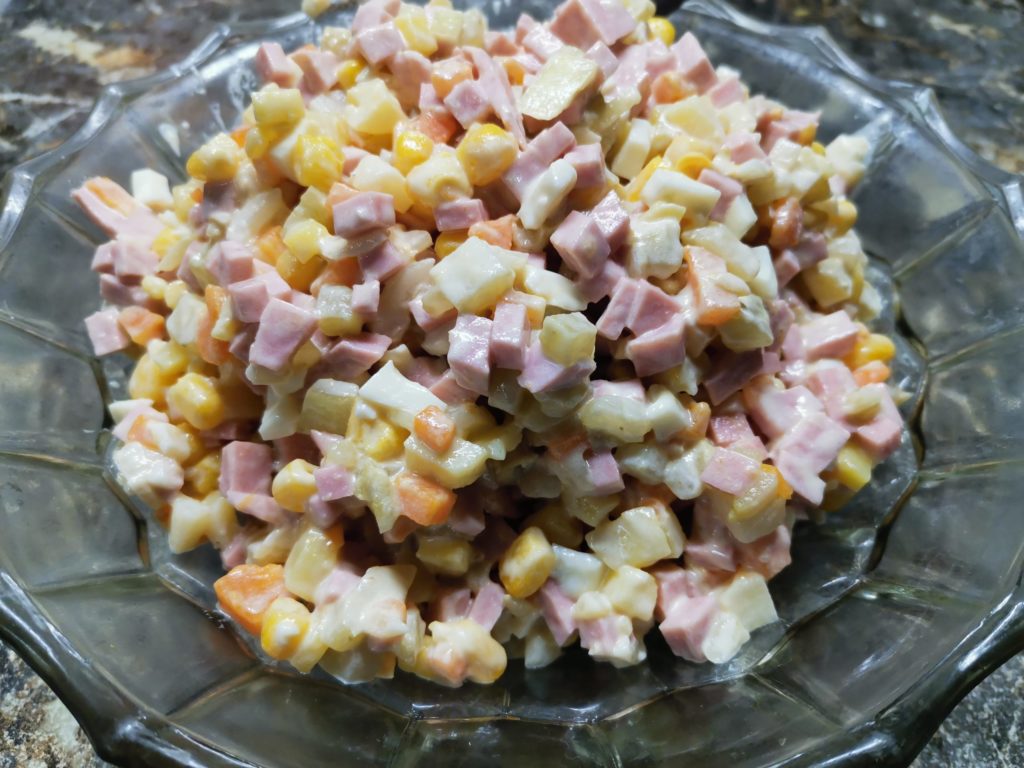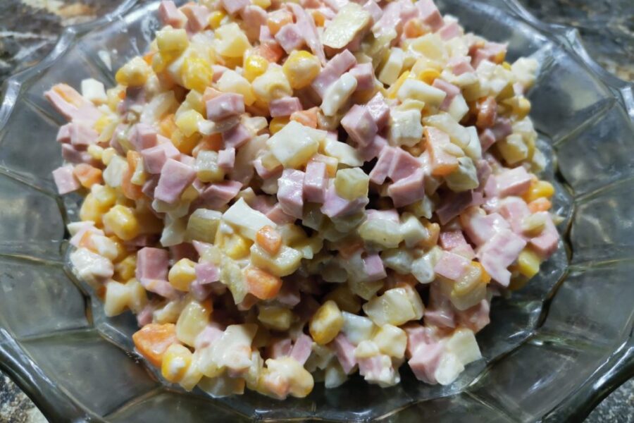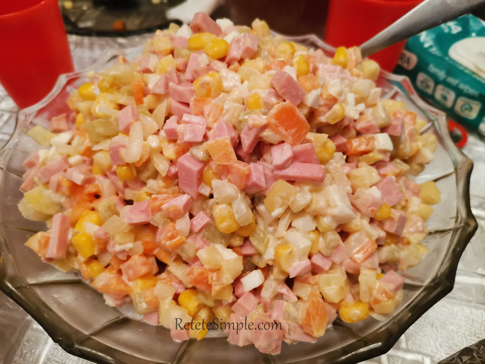 Оливье только с кукурузой. Горошек дети не любят в принципе, а вот такой вариант нравится всем. Вкус получается очень нежным, салат сочным. Попробуйте заменить горошек в вашем варианте приготовления, и я уверена, вам тоже понравится.