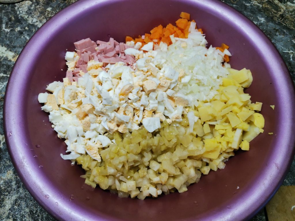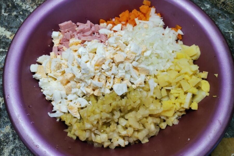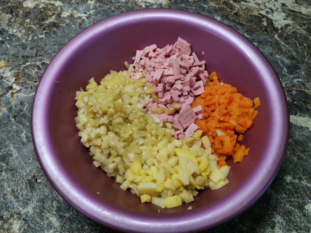 - Мелкими кубиками нарезаем картофель, морковь, колбасу, огурцы.