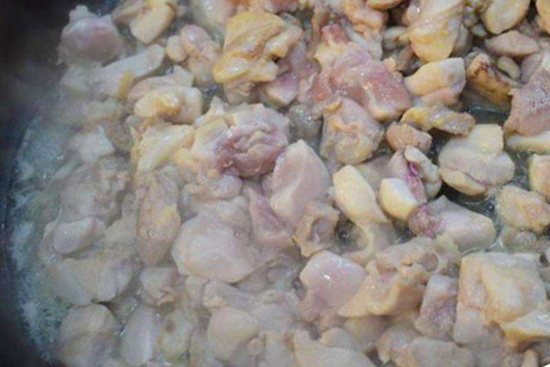 - Для начала обжариваем мелко нарезанное куриное мясо, с добавлением специй и соли. Время обжарки, минут пятнадцать.