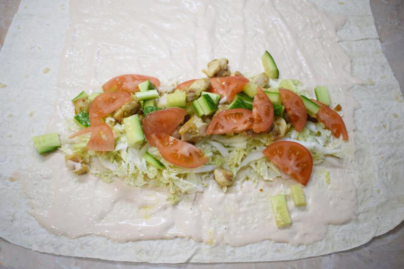 - Затем нам нужно смешать майонез и кетчуп для соуса и смазать им лаваш. Далее выкладываем наши овощи и обжаренную курочку на край лаваша.