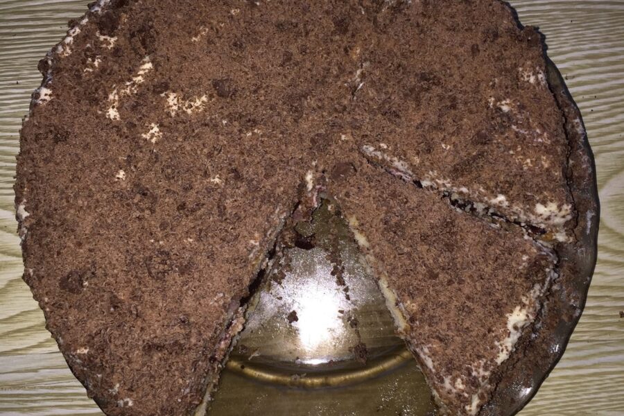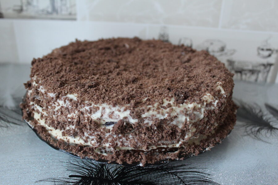 - Натереть шоколад на крупой терке, обсыпать крошкой верх и бока торта.
