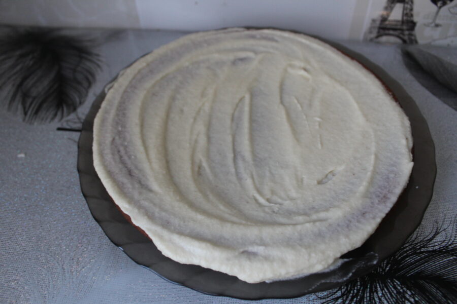 - Накрыть последним коржом, пропитать сладким соком и смазать верхушку и бока кремом.