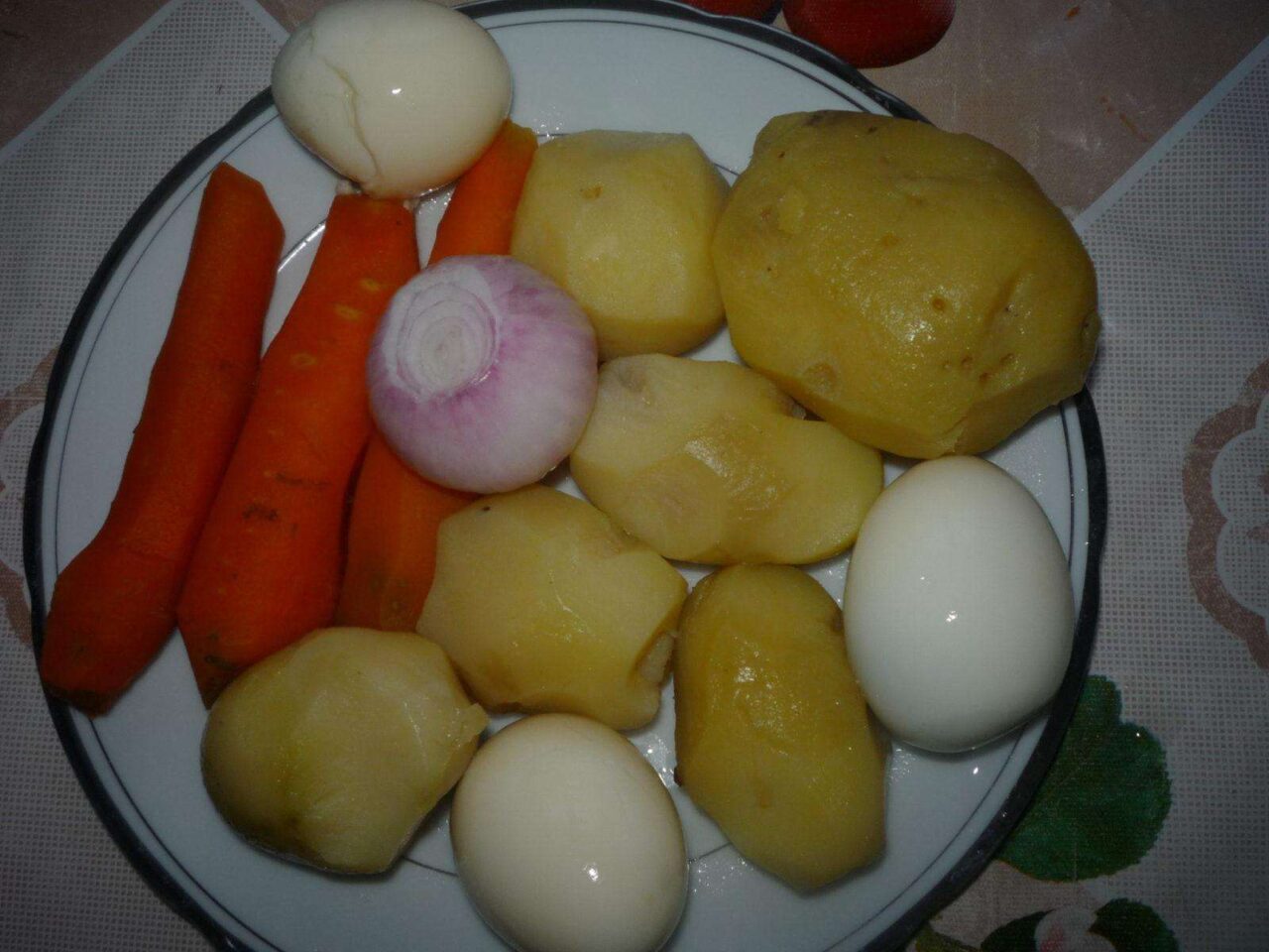 - Отвариваем морковь, картофель и яйца. Воду, в которой все готовится, обильно солим. Считается, что необходимо отваривать все ингредиенты по отдельности (в разных емкостях), чтобы сохранить их уникальный вкус. Но, по-моему, это предубеждения.