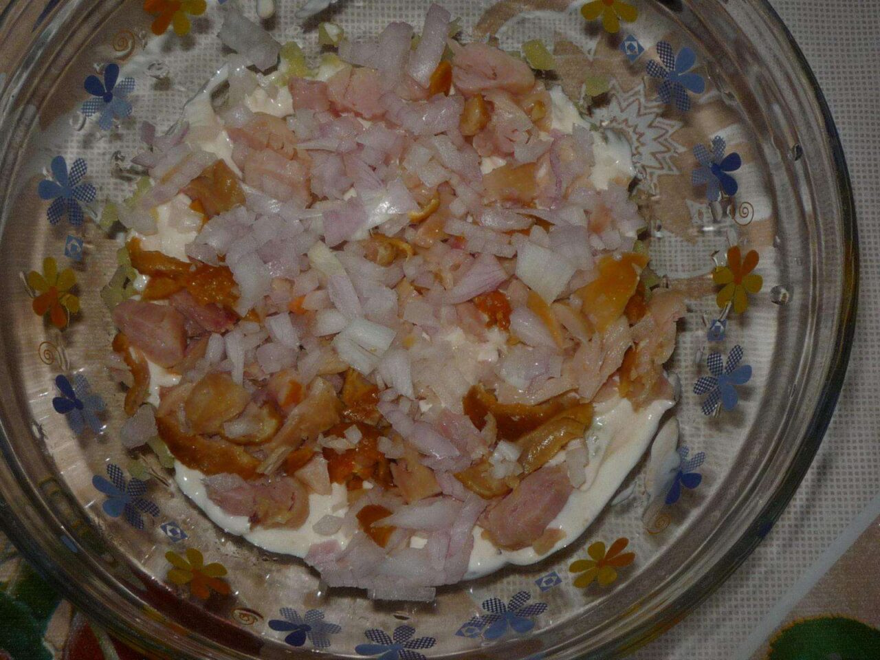 - Репчатый лук мелко шинкуем. Чтобы погасить его доминирующий вкус, выкладывать лук будем на копченое куриное мясо.