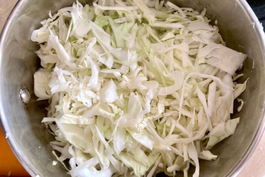 - Нашинкуйте капусту мелкими кусочками. Положите ее в кастрюлю и залейте кипятком. Дайте капусте полежать в кипятке в течение 10 минут, затем слейте воду.