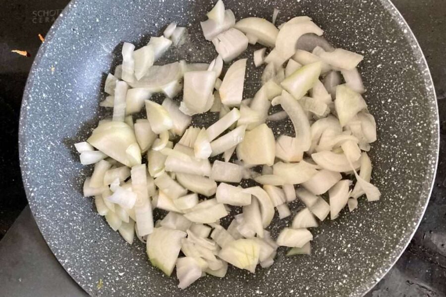 - Мелко нарежьте луковицу и обжарьте ее на сковороде с небольшим количеством масла до мягкости. Это займет около 1 минуты.
