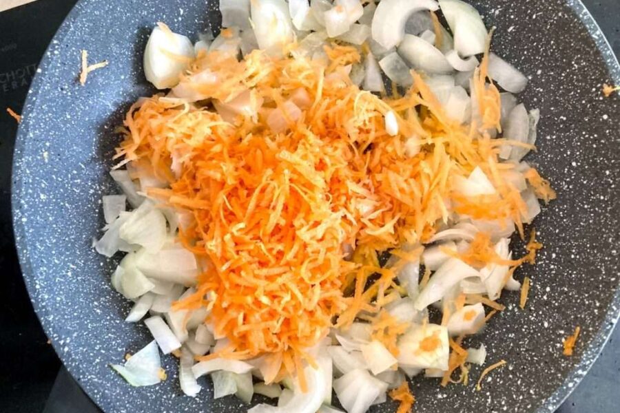 - Добавьте к обжаренному луку натертые на терке моркови. Жарьте вместе еще 1 минуту, помешивая овощи.