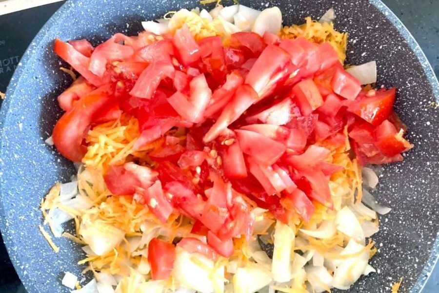 - Нарежьте помидоры мелкими кубиками и добавьте их к луку с морковью. Перемешайте и тушите овощи до мягкости и образования ароматного соуса. Это займет около 5-7 минут.