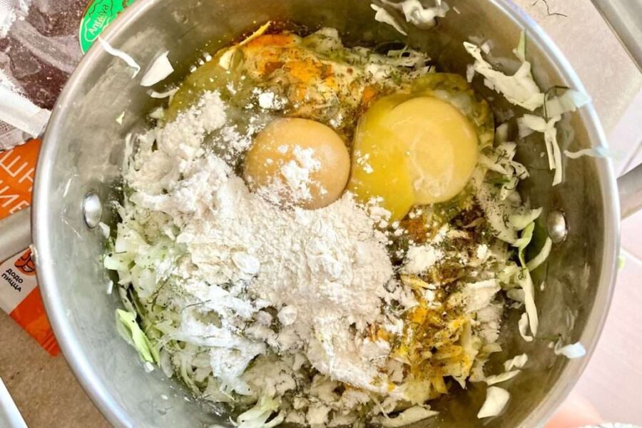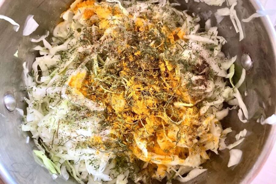 - Подготовка смеси для запеканки: в отдельной миске смешайте отжатую от воды капусту с солью и выбранными специями по вкусу.
