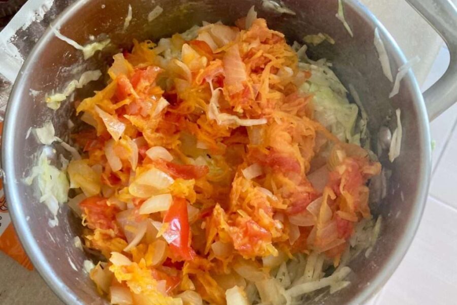 - Положите подготовленную смесь из лука, моркови и помидоров к капустной массе. Перемешайте все ингредиенты до равномерного распределения начинки.