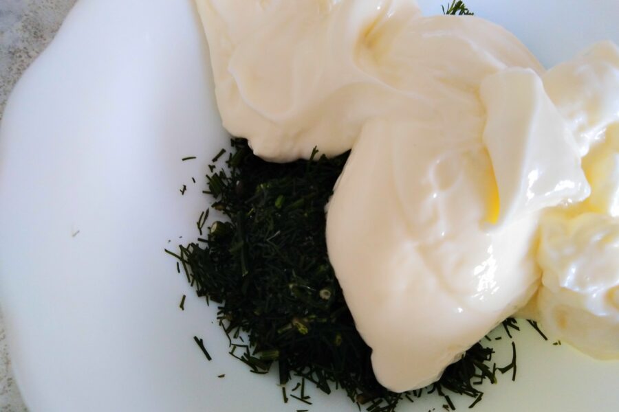 - Чеснок измельчается с помощью ножа и добавляется к укропу со сливочным сыром.