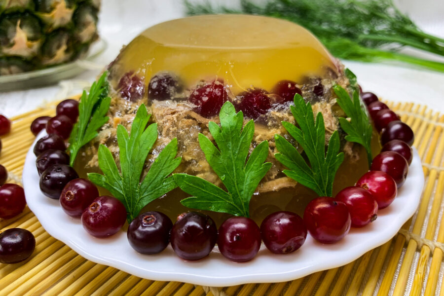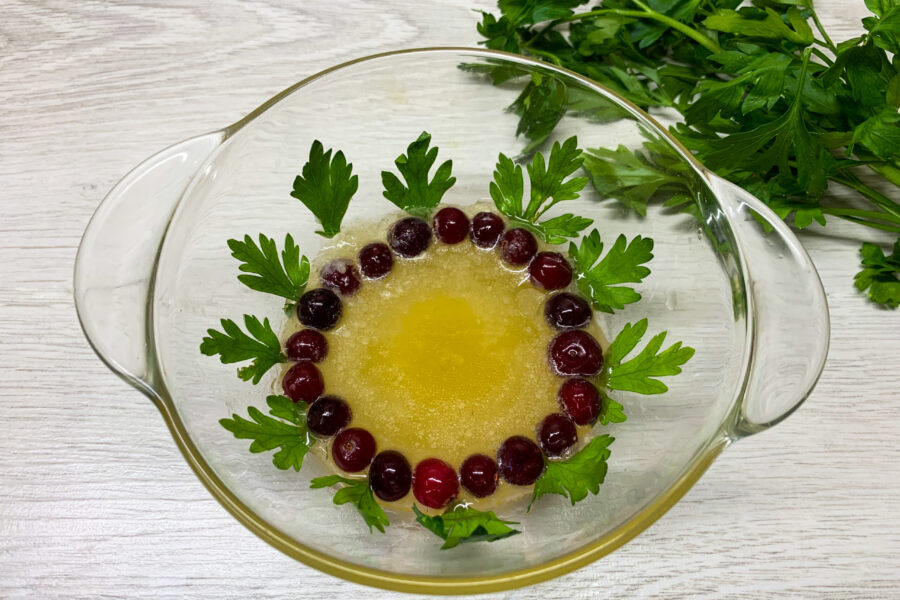 - Бульон соединяем с желатином, перемешиваем до полного растворения желатиновой смеси. В форму вливаем немного готового бульона с желатином и даем ему застыть. Затем сверху по кругу выкладываем ягодки клюквы и свежие листочки петрушки.