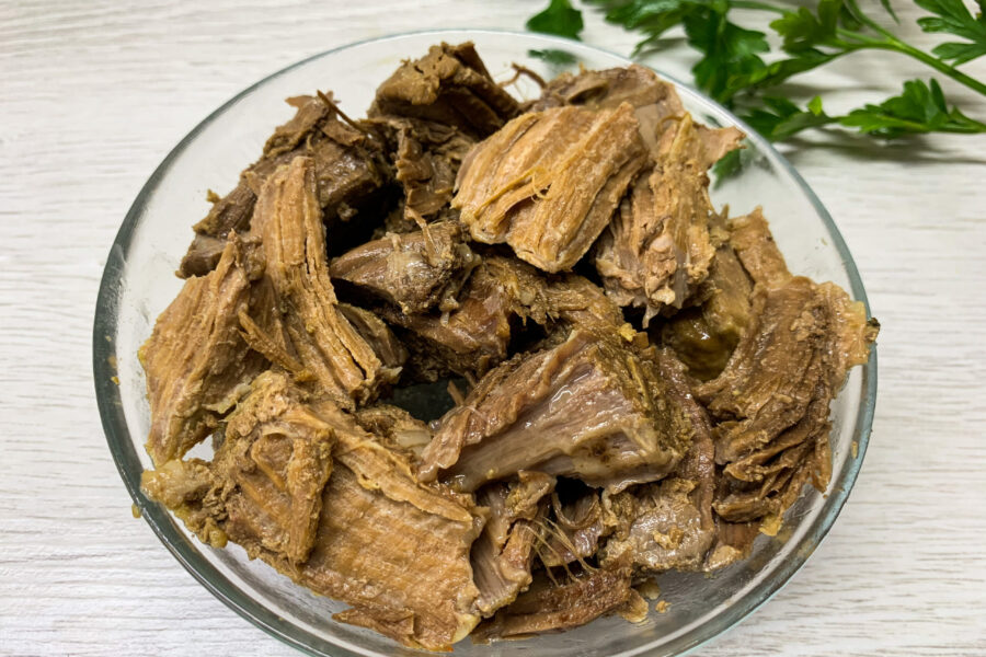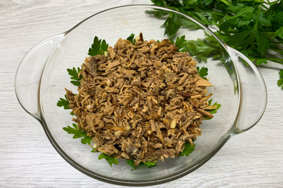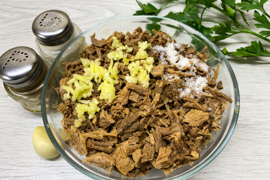 - Вареное мясо остужаем, крошим на средние кусочки, добавляем в него измельченные зубчики чеснока, чуть перца и соли. Тщательно перемешиваем мясную массу.