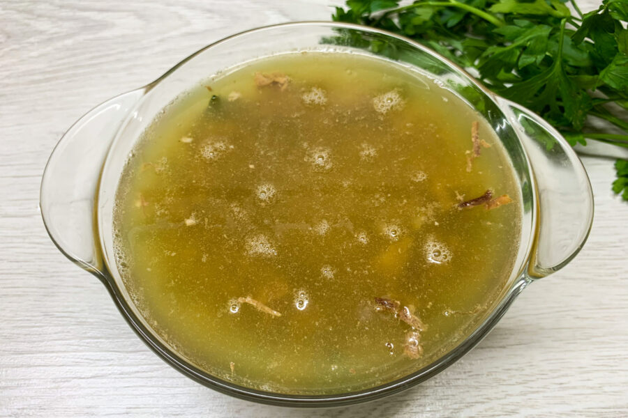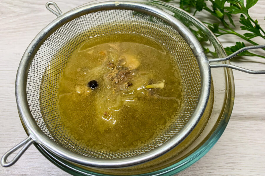- Бульон процеживаем через мелкое сито, пробуем на соль, при необходимости добавляем соль.