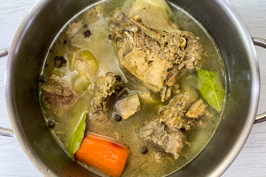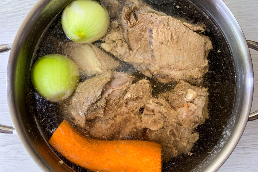 - Промываем мясо и отправляем в кастрюлю. Заливаем его водой, доводим до кипения. Затем сливаем воду вместе с пенкой и наливаем чистую фильтрованную воду. Варим примерно три часа. После этого кладем в бульон морковь и лук.