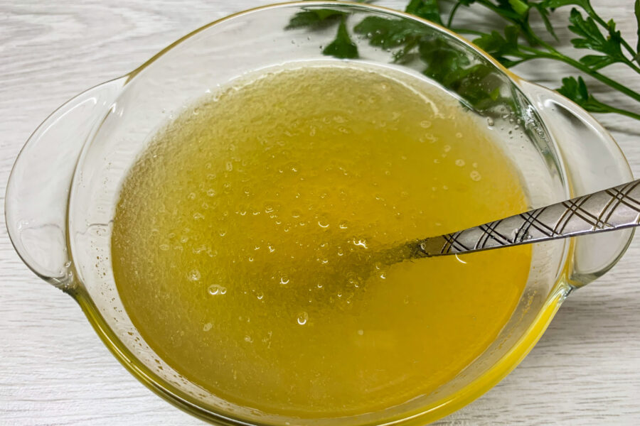 - В миску наливаем 1-2 стакана бульона и всыпаем желатин. Перемешиваем и оставляем для набухания на 40 минут.