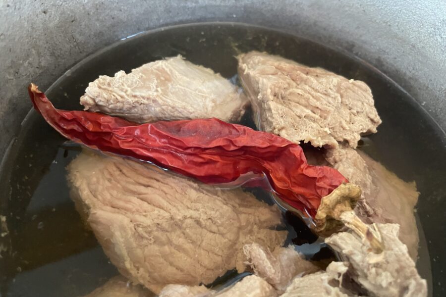 - Томить на малом огне около часа – до размягчения мясных волокон. За 5 минут до снятия телячьих кусочков с огня окунуть в получившийся концентрированный бульон перечный стручок, не разламывая его. Долго перец там держать не надо, чтобы не было чересчур остро.