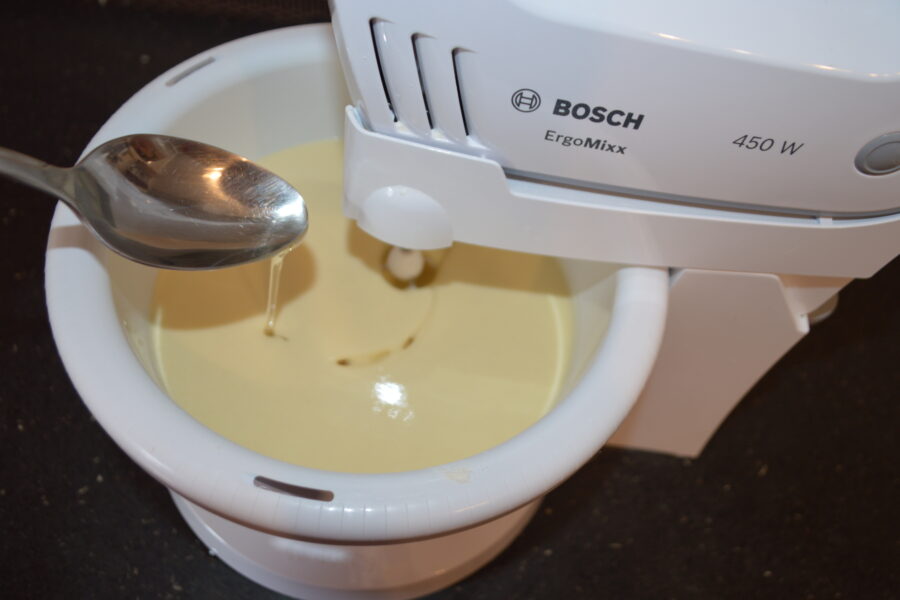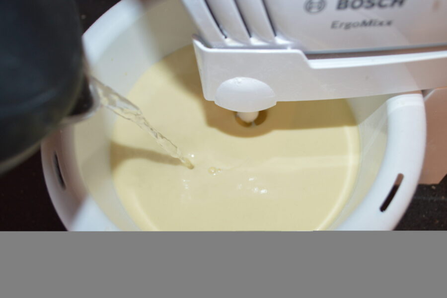 - И немного кипящей воды. Хорошо взбейте, пока не образуется консистенция, более жидкая, чем сливки.