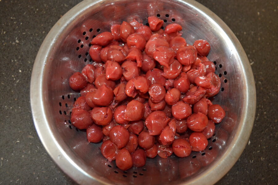 - Положите вишни в дуршлаг и дайте им стечь примерно полчаса.