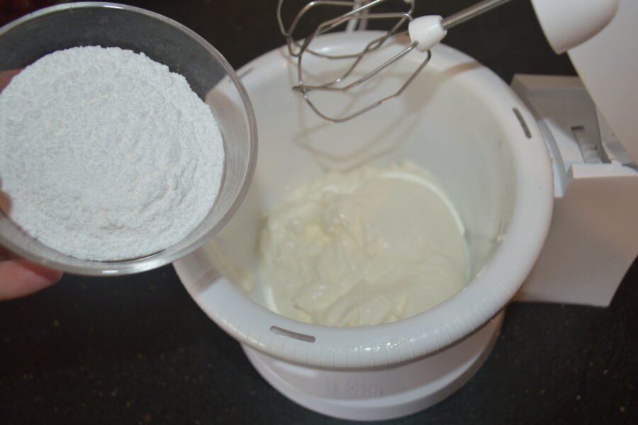 - Крем: добавьте сахарную пудру в сливки и взбивайте миксером 12-15 минут, пока не загустеет.