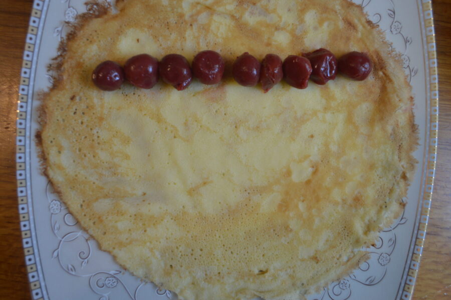 - После того, как блины остынут, возьмите по одному и выложите вишни в линию, затем сверните.