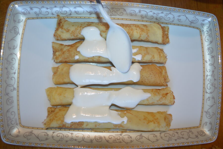 - Положите 5 блинчиков на тарелку или блюдо.