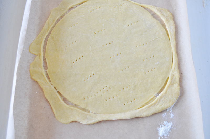 - Выложим один кусочек теста на пергамент, раскатаем его скалочкой. Сверху выложим обычную тарелочку. Вырежем круг, используя нож для пиццы.
