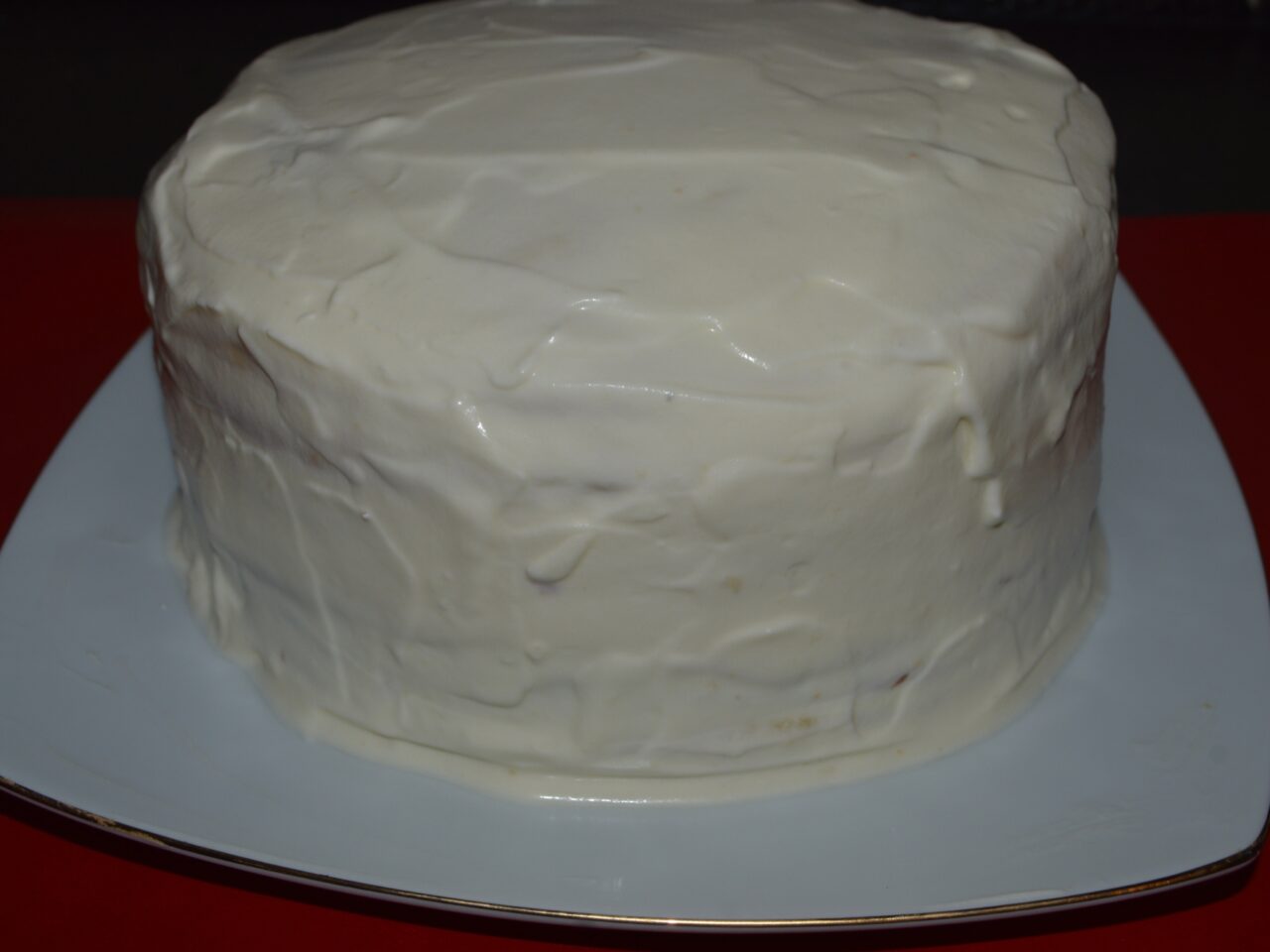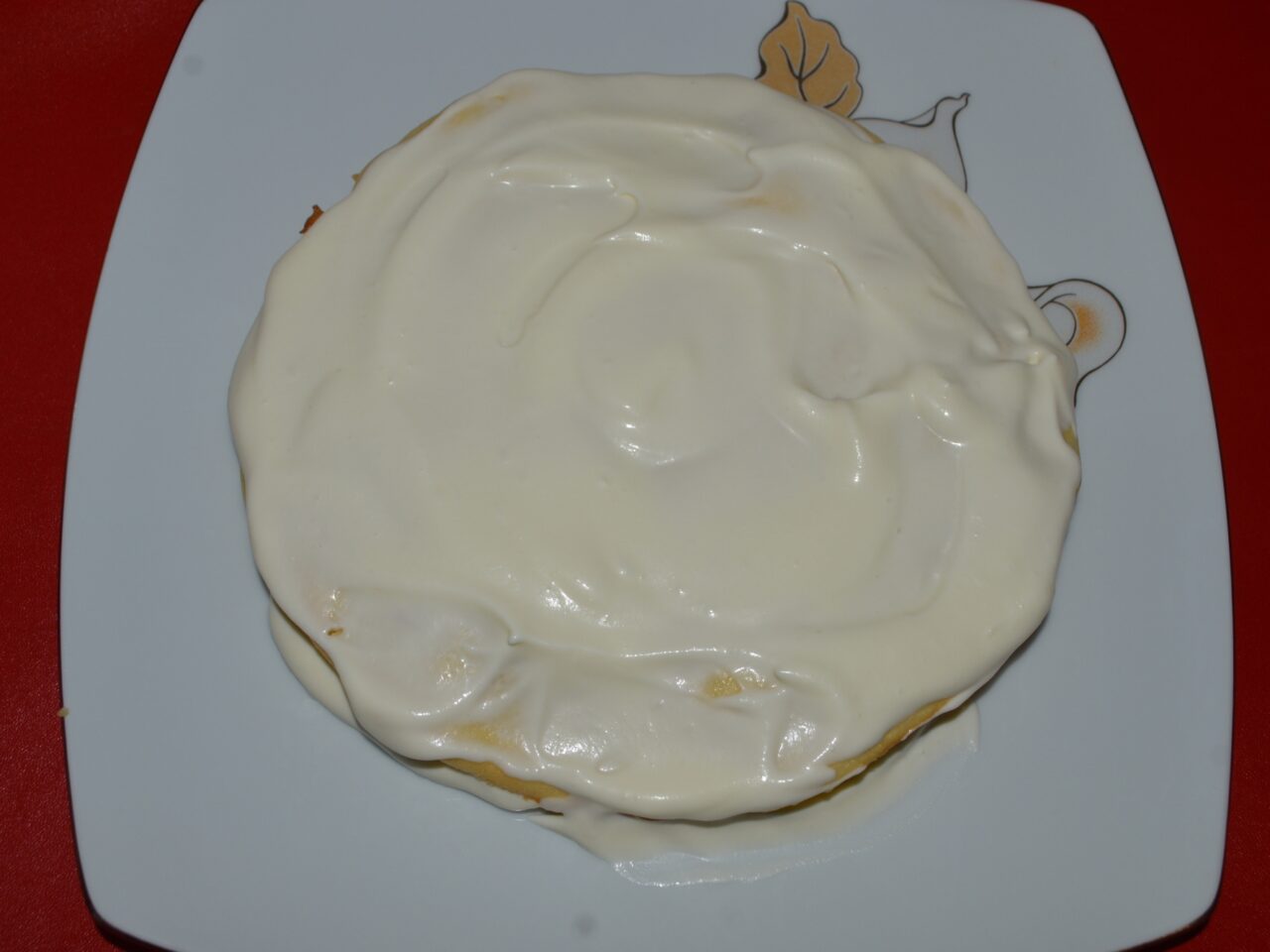 - Сборка торта: смажьте каждый корж кремом, примерно по 2-3 столовые ложки крема на каждый корж.