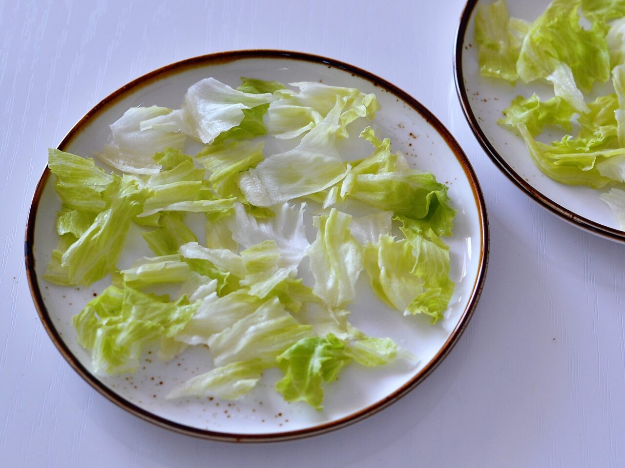 - Листья салата «Айсберг» хорошенько моем под проточной водой и рвём руками в хаотичном порядке. Выкладываем по порционным тарелкам.