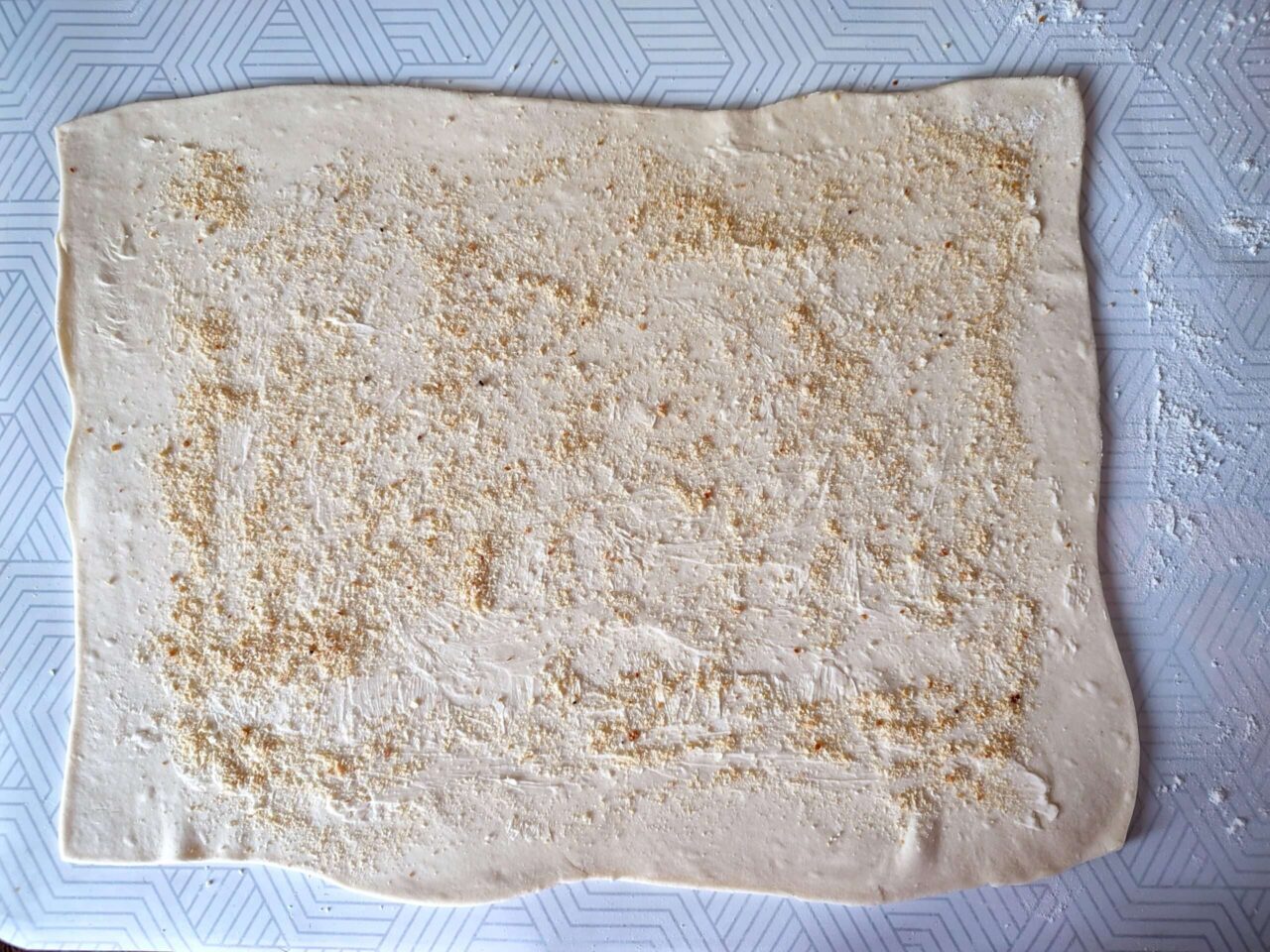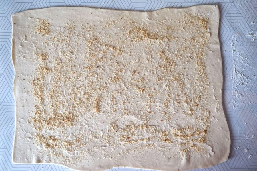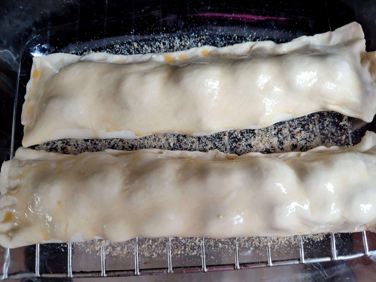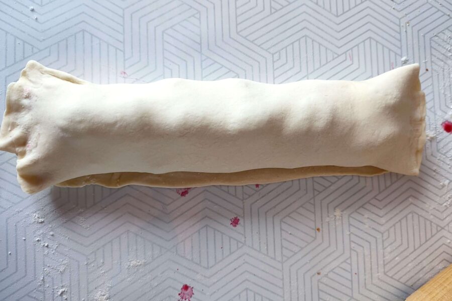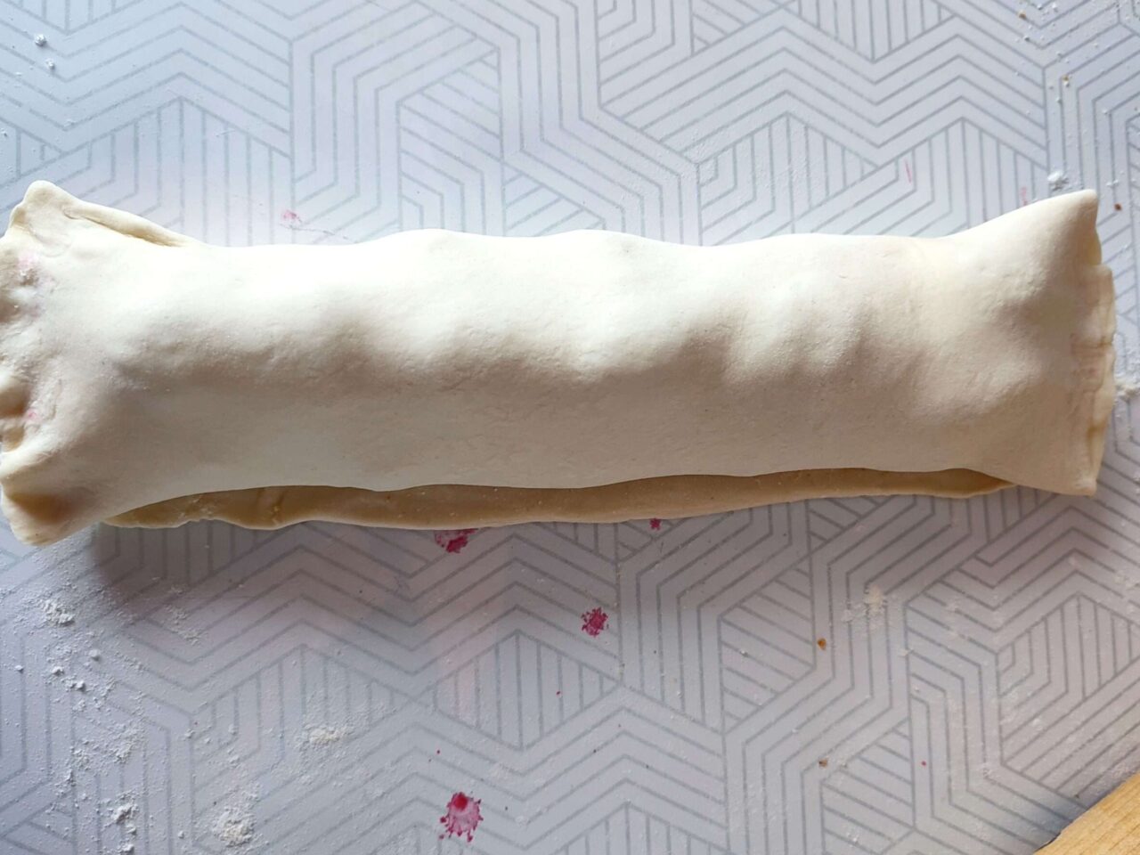 - Аккуратно свернуть рулетом штрудель и защипнуть края. Переложить получившиеся рулетики на подходящий по размеру противень, его необходимо предварительно посыпать мукой или манкой, можно застелить пергаментом.