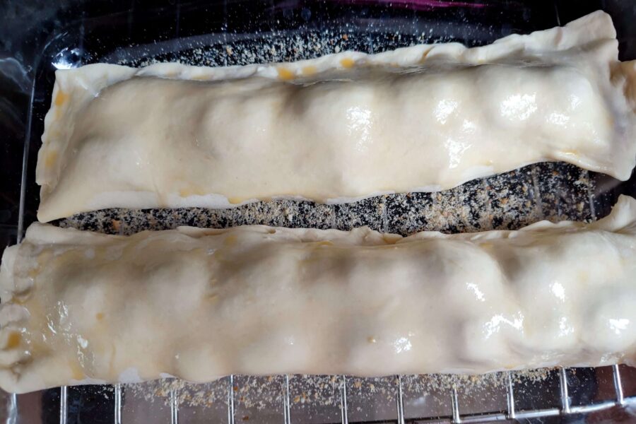 - Штрудель смазать слегка взбитым яйцом. Разогреть духовку до 190 градусов, поставить выпекаться штрудель на 40 минут.